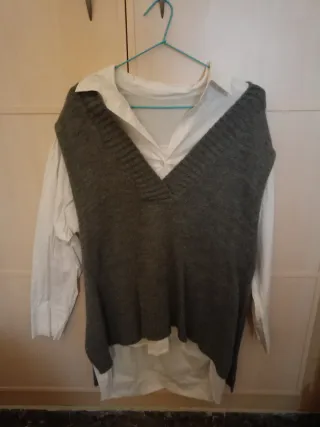 Conjunto de camisa larga blanca y suéter gris. - Camisa de manga larga. - Suéter de punto con cuello en V. Si se vendiese por separado cada cosa son 10€