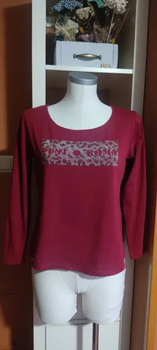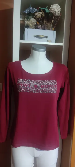 Bonita camiseta de manga larga en color granate. Presenta un diseño frontal con pedrería. - Detalle de pedrería en la parte delantera. - Manga larga.