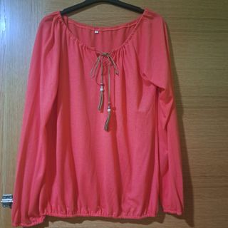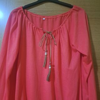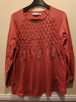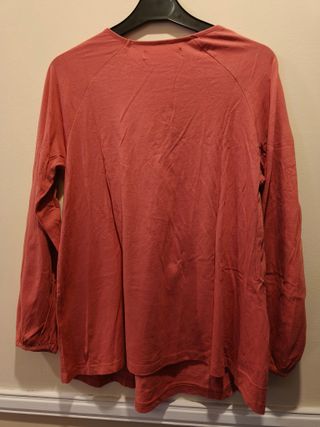 Preciosa camiseta de color coral, talla S. Es una prenda bonita y cómoda, ideal para el día a día. - Diseño de cuello redondo con detalle de cordón. - Mangas largas. - Tejido suave.