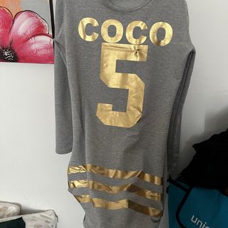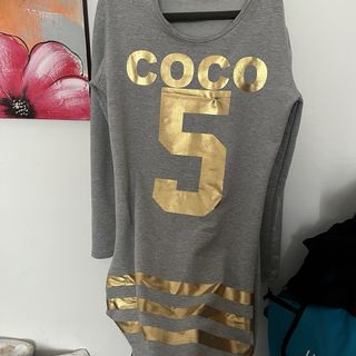 Vestido tipo túnica con diseño llamativo. - Estampado frontal COCO 5 en dorado. - Detalle de rayas doradas en el bajo. - Manga larga.