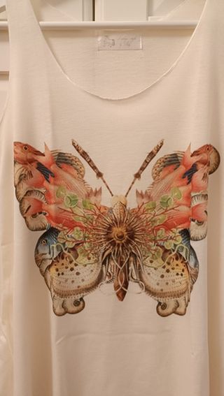Preciosa camiseta de tirantes con estampado de mariposa. Es de color amarillo con detalles multicolor y purpurina. - Diseño original y colorido. - Talla S. - Perfecta para verano.
