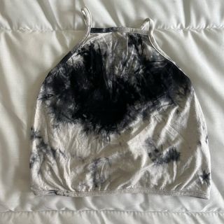 Top corto de tirantes, con diseño tie-dye en tonos grises y negros. Talla: S/36. Una puesta. COMO NUEVA. - Diseño halter, atado al cuello. - Espalda descubierta con tiras. - Estampado tie-dye único. - Ligero, cómodo. - Marca: Shein.