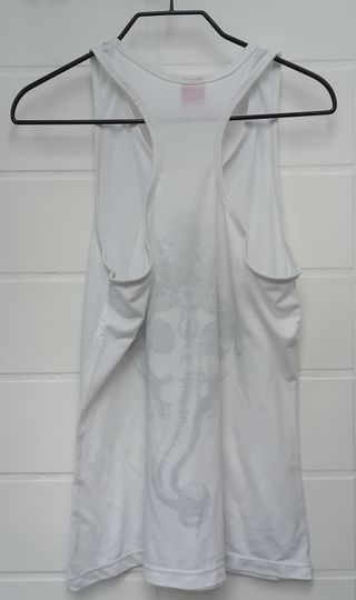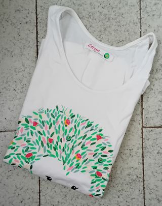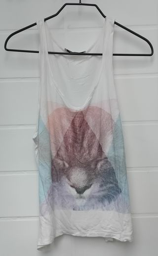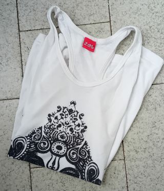 Camiseta con motivo pictórico de elefante de tirantes. La prenda tiene una pequeña mancha en la costura final del uso (adjunto en imagen). A parte de ello se conserva en muy buen estado de talla S-M.