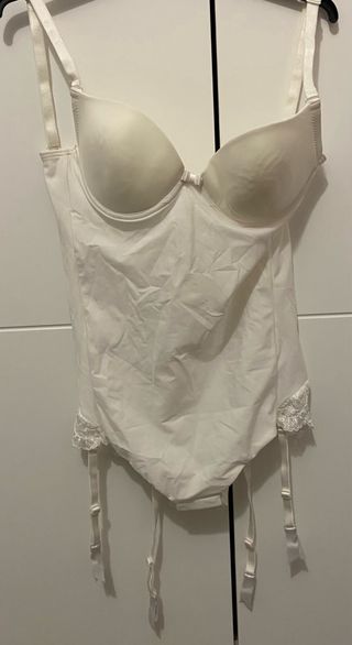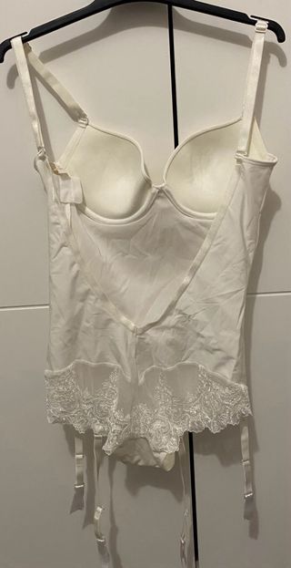 Body blanco con detalles de encaje en los laterales y tirantes. - Copas con relleno. - Tirantes ajustables. - Ganchos en la parte inferior.