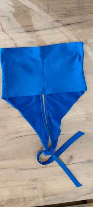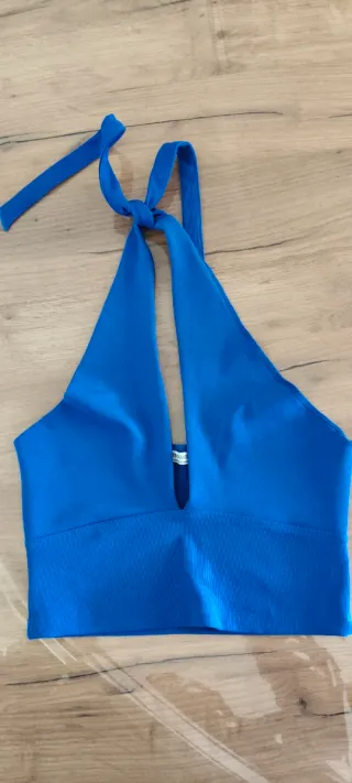 Top de estilo halter en color azul vibrante. Su diseño es moderno y favorecedor. Escote pronunciado en V. Tirantes que se anudan al cuello. Tejido elástico y cómodo. Talla S.