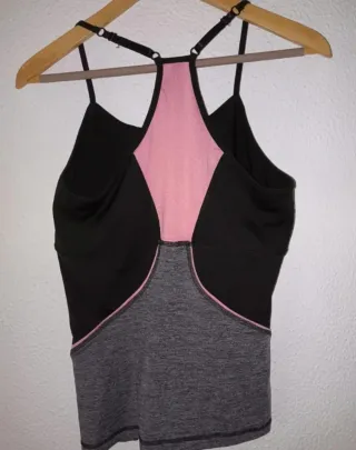 Camiseta deportiva - Diseño con tirantes. - Panel frontal en color rosa. - Paneles laterales en gris con costuras rosas. - La talla viene pequeña, como para una S/M.
