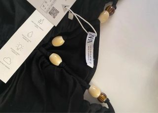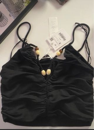 Top negro de Zara con un diseño fruncido y detalles de cuentas de madera. - Tirantes finos ajustables. - Escote pronunciado con cordones. - Adornos de cuentas de madera en los tirantes.