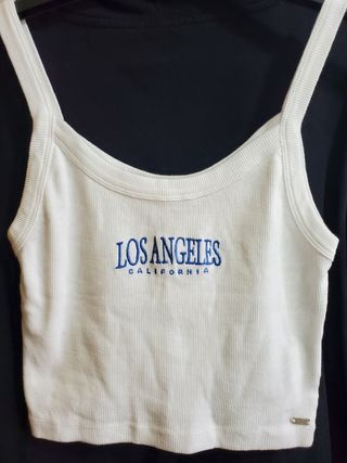 Top cropped Texto bordado (Los Ángeles- California) Tirantes, cuello redondo Nuevo, con etiquetas Color: Blanco y azul Talla: S Marca: Pull & Bear Material: 96% algodón, 4% elastano *Hago envíos* *Si tienes alguna duda, puedes preguntarme sin problema*