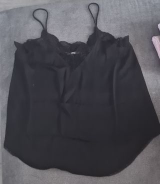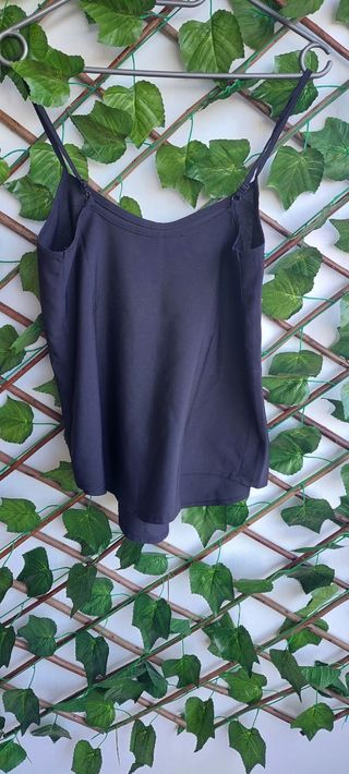 Preciosa camiseta de tirantes negra de H&M, talla S. Es de un tejido suave y agradable al tacto. Tiene un detalle de encaje en el escote que le da un toque elegante. (Sólo usado 1 vez) - Talla S (equivalente a 36 u 8) - Ajuste entallado. - Detalle de encaje.