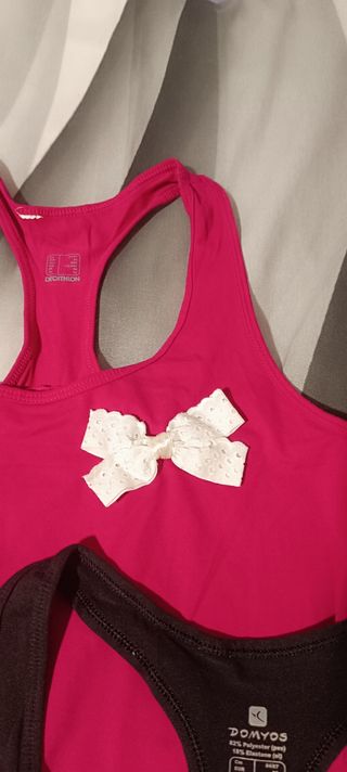 4 camisetas de tirantes. logotipo de Decatlón tapado con detalles hechos a mano. la azul, marca crivit. talla 36-38, ya que son elásticas.