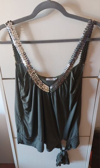 Preciosa camiseta de tirantes en color verde militar, talla S. Tiene detalles de tela de encaje en los bordes. Nunca se ha usado