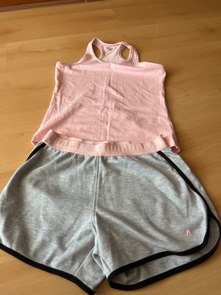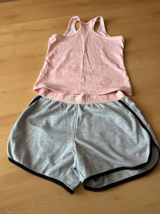 Conjunto deportivo para mujer, compuesto por una camiseta de tirantes rosa y unos shorts grises. La camiseta es de algodón suave y los shorts tienen un corte cómodo. Ideales para hacer deporte o para el día a día. - Talla: (Añadir talla) - Material: Algodón (especificar si se conoce) - Estado: Usado, en buen estado (especificar si hay algún desperfecto)
