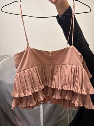 Top de Zara con un diseño muy especial y femenino. Ideal para darle un toque chic a tu look. - Volantes plisados en cascada. - Tirantes finos. - Corte cuadrado.