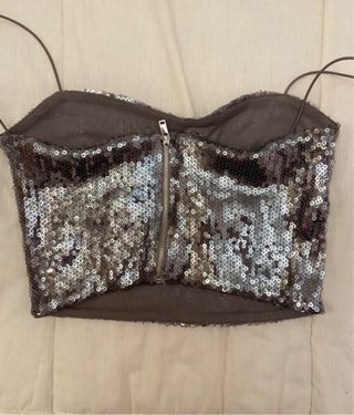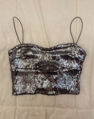 Top brillante con lentejuelas plateadas y un diseño llamativo. - Diseño con abertura frontal. - Tirantes finos. - Acabado metalizado. Talla como una S aunque ponga M en la etiqueta. Solo puesto una vez.