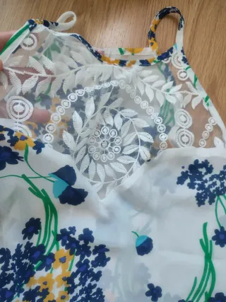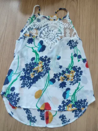 Bonita blusa de tirantes con un estampado floral vibrante, perfecta para el verano. Presenta un detalle de encaje en la parte superior. Da talla S (36/38) - Diseño de tirantes. - Estampado floral multicolor. - Detalle de encaje en el escote.