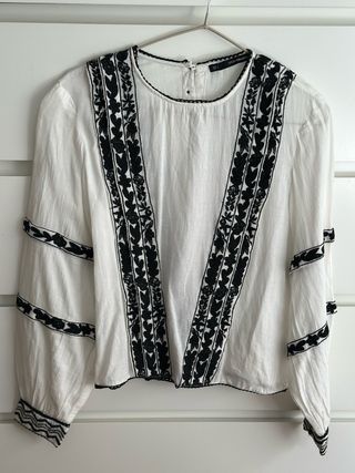 ✨ Blusa blanca estilo boho con bordado negro 🏷 Marca: Sfera 📏 Talla: S 📌 Estado: Como nueva (puesta una sola vez) Blusa blanca con detalles bordados en negro y mangas amplias. Estilo boho/ibicenco, muy favorecedora y cómoda. Ideal con vaqueros, shorts o para primavera/verano. Está perfecta, sin manchas ni desgaste.