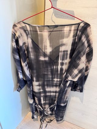 Blusa de manga larga con un llamativo estampado. - Diseño cruzado con nudo lateral. - Tejido semitransparente. - Cuello camisero.