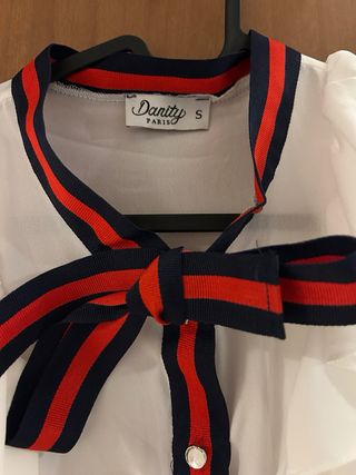 Elegante blusa de la marca Dantty con un diseño inspirado en París. - Color blanco con detalles en rojo y azul marino. - Cuello con lazada y volantes. - Mangas acampanadas con volantes. - Bolsillos delanteros con ribete. - Cierre de botones.