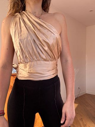 Elegante top crop de seda en color champagne. Un diseño único con drapeados que le dan un toque sofisticado. - Tejido sedoso. - Diseño asimétrico. - Detalle de fajín.