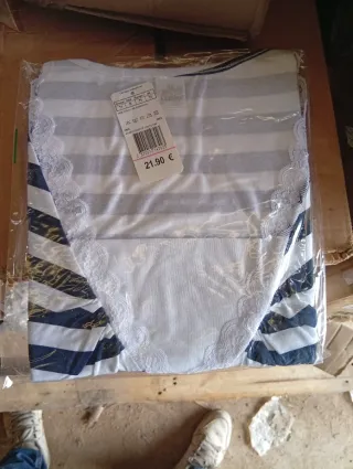 Camiseta de manga corta con diseño de rayas. Presenta un delicado detalle de encaje en el cuello y los puños. - Composición: 96% Algodón - 4% Elastano. - Talla: T1 (equivalente a S/M en otras tallas). - Color: Blanco y azul marino.