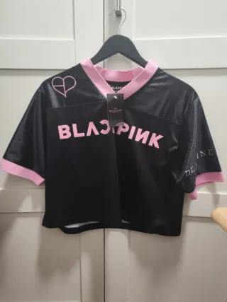 Camiseta negra con detalles en rosa, inspirada en el tour de Blackpink en Barcelona. Diseño moderno y llamativo. - Cuello y mangas con ribete rosa. - Logo de Blackpink en la parte delantera. - Estampado BLACKPINK en rosa. Escucho ofertas