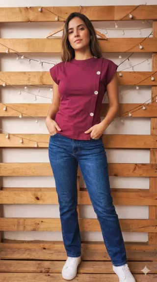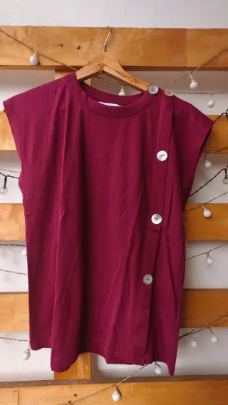 Camiseta de manga corta con un diseño original y moderno. - Cuello redondo. - Cierre asimétrico con botones. - Detalle de costuras.