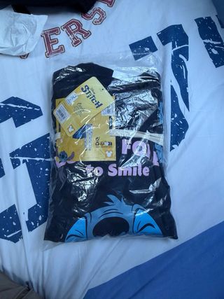 Conjunto de pijama de Disney con el personaje Stitch. Incluye camiseta y pantalón. - Camiseta negra con estampado. - Pantalón gris con estampado. - Talla S.