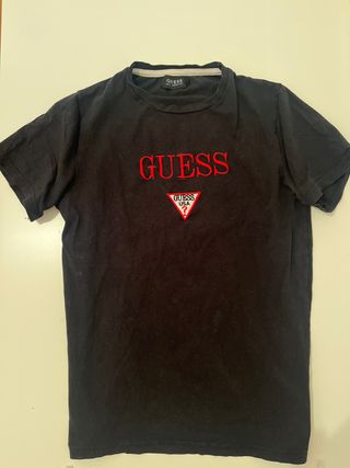 Camiseta de manga corta con el logo de Guess. - Diseño frontal con el nombre de la marca bordado en rojo. - Parche triangular de Guess USA en el pecho.