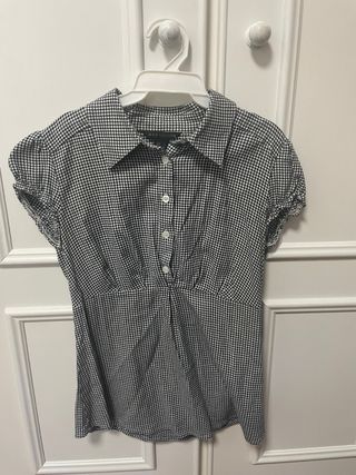 Blusa de cuadros con botones de la marca Mango. - Diseño de cuadros blanco y negro. - Cuello camisero. - Mangas cortas abullonadas. - Cierre de botones en la parte delantera.
