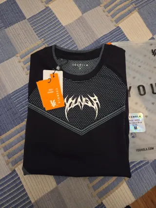 Camiseta deportiva de la marca Yougla. Nota talla M en compresion en Youngla es como si fuese una S en gymshark - Diseño con paneles de malla. - Detalles en color gris. - Cuello redondo.