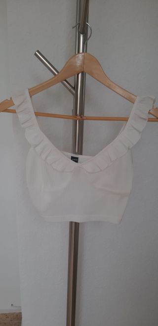 Top con volantes en el escote. Nuevo. Talla S. Color blanco. Muy bonito. #vestido #denim #vaquero #zara #etiqueta #estrenar #fiesta #formal #boda #midi #largo #mini #corto #pantalones #falda #blazer #chaqueta #traje #americana #shein #primark #lefties #zapatos #top #perlas #volantes #strass #brillo #brillante #blusa #encaje #lentejuelas #bolso