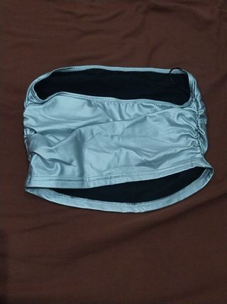 Top corto con un diseño moderno y favorecedor. Su tejido es ligero y agradable al tacto. Color plateado - Acabado satinado. - Detalle fruncido en los laterales. - Diseño sin tirantes.
