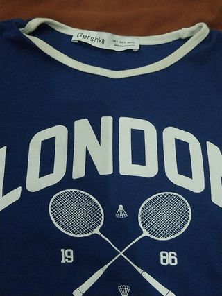 Camiseta de manga corta con estampado. Talla S Bershka - Diseño LONDON ENGLAND BADMINTON TEAM. - Cuello y mangas con ribete blanco. - Estampado de raquetas de bádminton y volante.