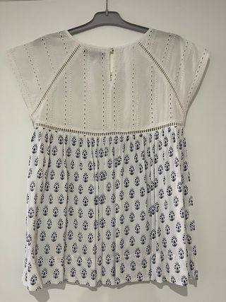 Preciosa blusa veraniega de Cortefiel, en perfecto estado. • Talla: S • Color: Blanco con detalles en azul marino • Diseño: Parte superior de encaje troquelado con patrón geométrico y floral, y parte inferior con estampado delicado. • Muy fresca, ligera y favorecedora. Ideal para días cálidos o looks casuales con un toque elegante. Sin manchas ni desperfectos.