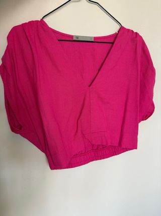 Blusa corta de lino en vibrante color fucsia. Diseño moderno y cómodo. - Corte holgado. - Escote en V. - Bajo elástico.