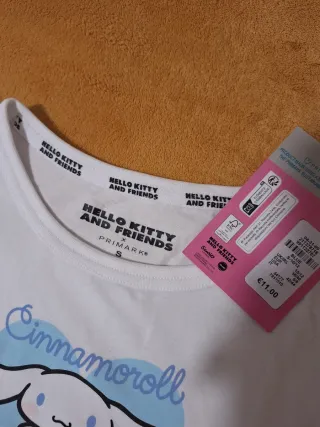 Camiseta blanca con estampado de Cinnamoroll. - Diseño frontal con Cinnamoroll sobre un corazón azul. - Cuello redondo y manga corta. - Detalle de texto Hello Kitty and Friends en el cuello.