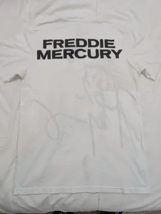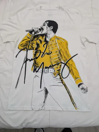 Camiseta blanca con estampado de Freddie Mercury de Queen. - Diseño icónico del artista. - Manga corta. - Cuello redondo.