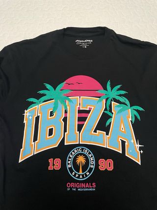 Preciosa camiseta de Jack & Jones. Es de color negro y tiene un diseño chulo de Ibiza. 🌴🌴🌴 - Talla: No especificada en la imagen - Estampado: Ibiza, palmeras y puesta de sol. (PRECIO NEGOCIABLE)