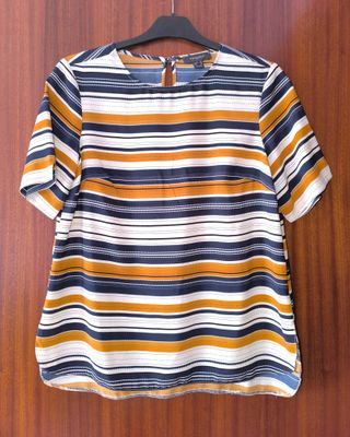 Camiseta de manga corta con un diseño de rayas horizontales en varios colores. Es cómoda y ligera. - Cuello redondo. - Cierre de botón en la nuca. - Bajo redondeado.