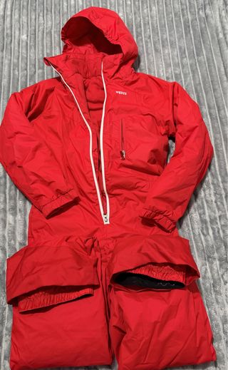 Mono de esquí WEDZE rojo Casco blanco Gafas