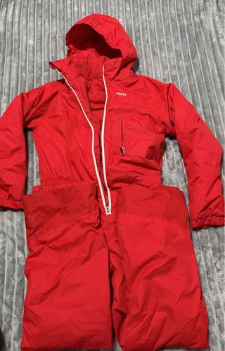 Mono de esquí completo en color rojo, perfecto para disfrutar de la nieve. - Cremallera frontal. - Bolsillo en el pecho. - Capucha integrada. Casco blanco talla S Gafas Camiseta nueva sin estrenar con etiqueta