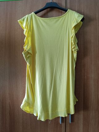 Preciosa camiseta de color amarillo. Es de manga corta con volantes. Luce impecable y está lista para usarse. - Talla S - Diseño con volantes en las mangas y el bajo. - Tejido suave y ligero.