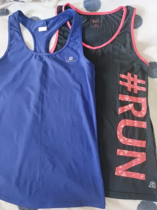 Conjunto de dos camisetas deportivas. - Camiseta azul con espalda cruzada. - Camiseta negra con estampado #RUN en rosa.