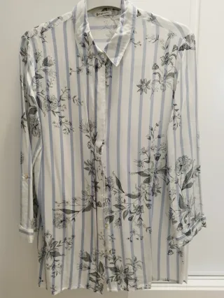 Camisa de Stradivarius con un diseño de rayas verticales y estampado floral. - Diseño de rayas azules y blancas. - Estampado de flores en tonos grises y negros. - Cuello camisero. - Cierre de botones. - Mangas francesa.
