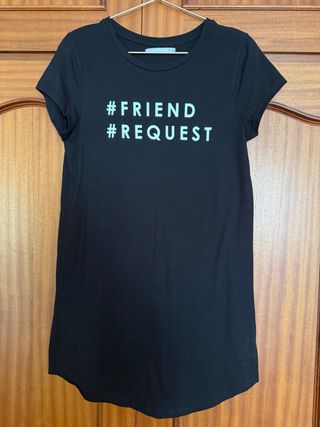 Camiseta tipo vestido de manga corta con un diseño moderno. - Estampado frontal con texto #FRIEND #REQUEST. - Corte recto y cómodo.