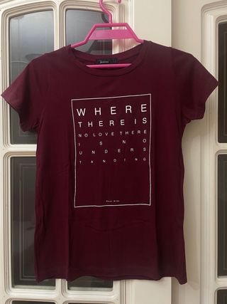 Preciosa camiseta de Zara, color rojo intenso. Es de manga corta y tiene un estampado chulo con texto en negro. - Perfecta para el verano. - Talla S. - Está en muy buen estado.
