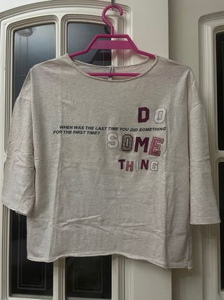 Camiseta de manga 3/4 con un diseño gráfico inspirador. - Estampado DO SOME THING. - Frase WHEN WAS THE LAST TIME YOU DID SOMETHING FOR THE FIRST TIME? - Cuello redondo. - Bajo deshilachado.