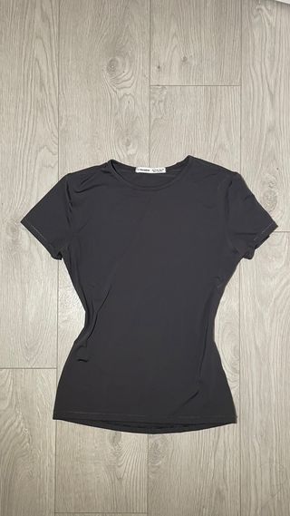 Precioso top negro de Stradivarius, talla S. Es de tejido de canalé y tiene una abertura en la parte delantera. - Escote redondo. - Diseño corto. - Perfecto estado.