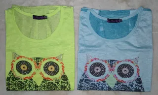 Conjunto de dos camisetas para mujer con un divertido estampado de búho. Talla S/M. - Diseño con lentejuelas y detalles brillantes. - Cuello redondo y manga corta. - Tejido ligero y cómodo.