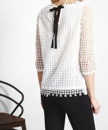 Camiseta de guipur de la marca Sweewë. Cuello redondo con borlas. Manga 3/4. Forro integrado. Tiras negras para anudar detrás. Materia: 100% poliéster. En la etiqueta pone talla S/M. A estrenar; con etiqueta.